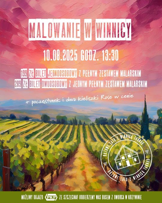 Zapraszamy na pierwsze w historii naszej winnicy malowanie wśród krzewów winorośli! Uczestnikom towarzyszyć będą nasze różowe wina, zjawiskowe pejzaże i fantastyczna atmosfera. Warsztaty poprowadzi Sylwia Zarzycka, lokalna plastyczka i malarka. Maurycy zadba o to, żeby wina nie zabrakło w kieliszkach, i opowie o naszym Rose i Perle Rose.