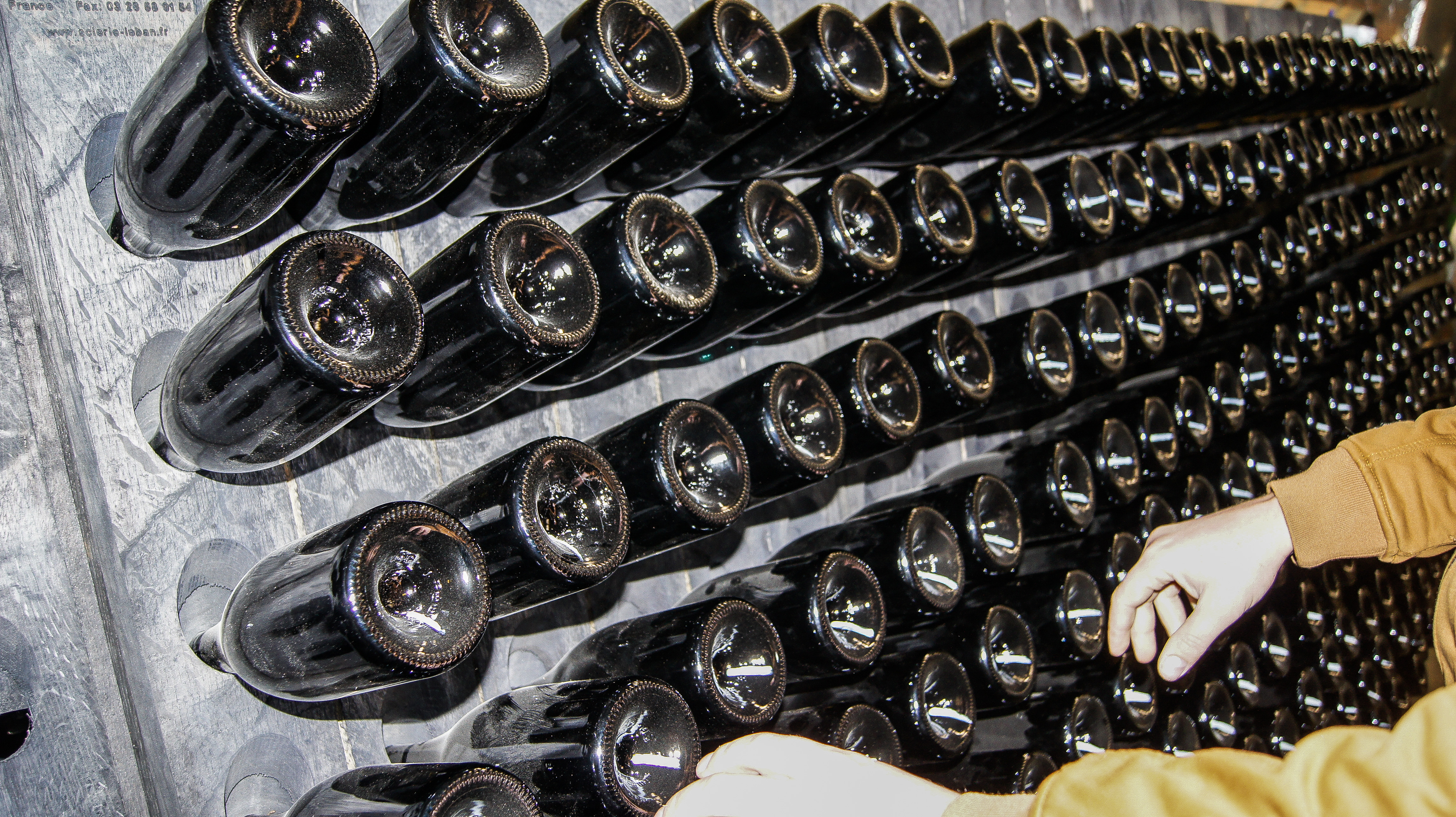 • Kiedy winiarz podejmie decyzję o zakończenia dojrzewania wina na osadzie, musi usunąć osad drożdżowy z wnętrza butelki. Wykonuje się to poprzez schematyczne obracanie butelek. Ruch powoduje spłynięcie osadu do szyjki. Obecnie praca ta wykonywana jest najczęściej przez automatyczne żyropalety w parę dni, ale w wielu miejscach nadal odbywa się ręcznie. W takich tradycyjnych winnicach, wyszkoleni pracownicy, obracają nawet do kilku tysięcy butelek dziennie przez okres kilku tygodni! Jako ciekawostkę dodam, że moi koledzy z Winnicy Turnau wzięli sobie do serca tę żmudną pracę. Przez 4 tygodnie dzień w dzień wykonywali tajną sekwencję ruchów, aby leniwy osad w końcu spłynął do szyjki.