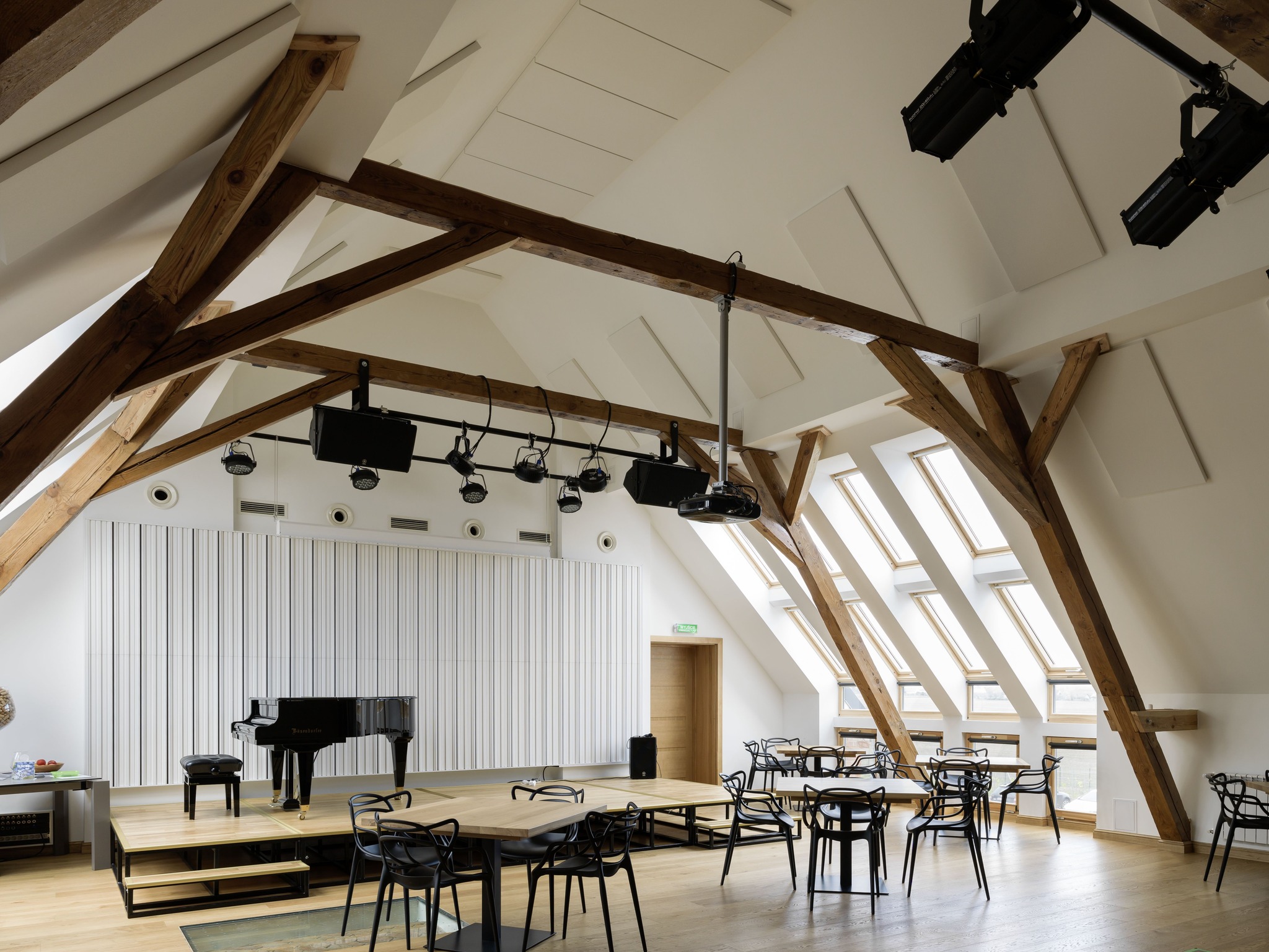 Sala koncertowa – muzyczne serce naszej winiarni. Uwielbiamy, kiedy wypełnia się ludźmi i muzyką.