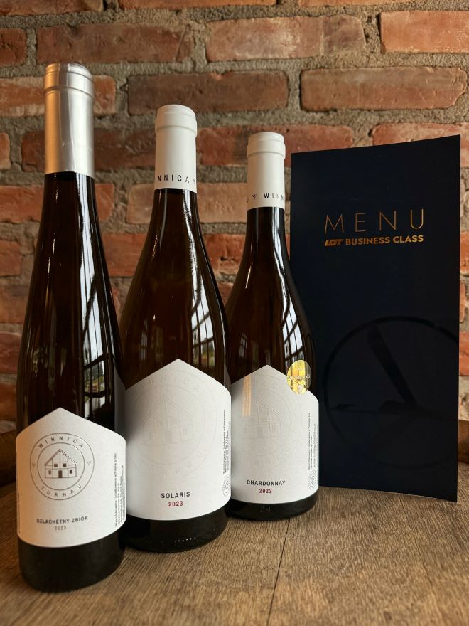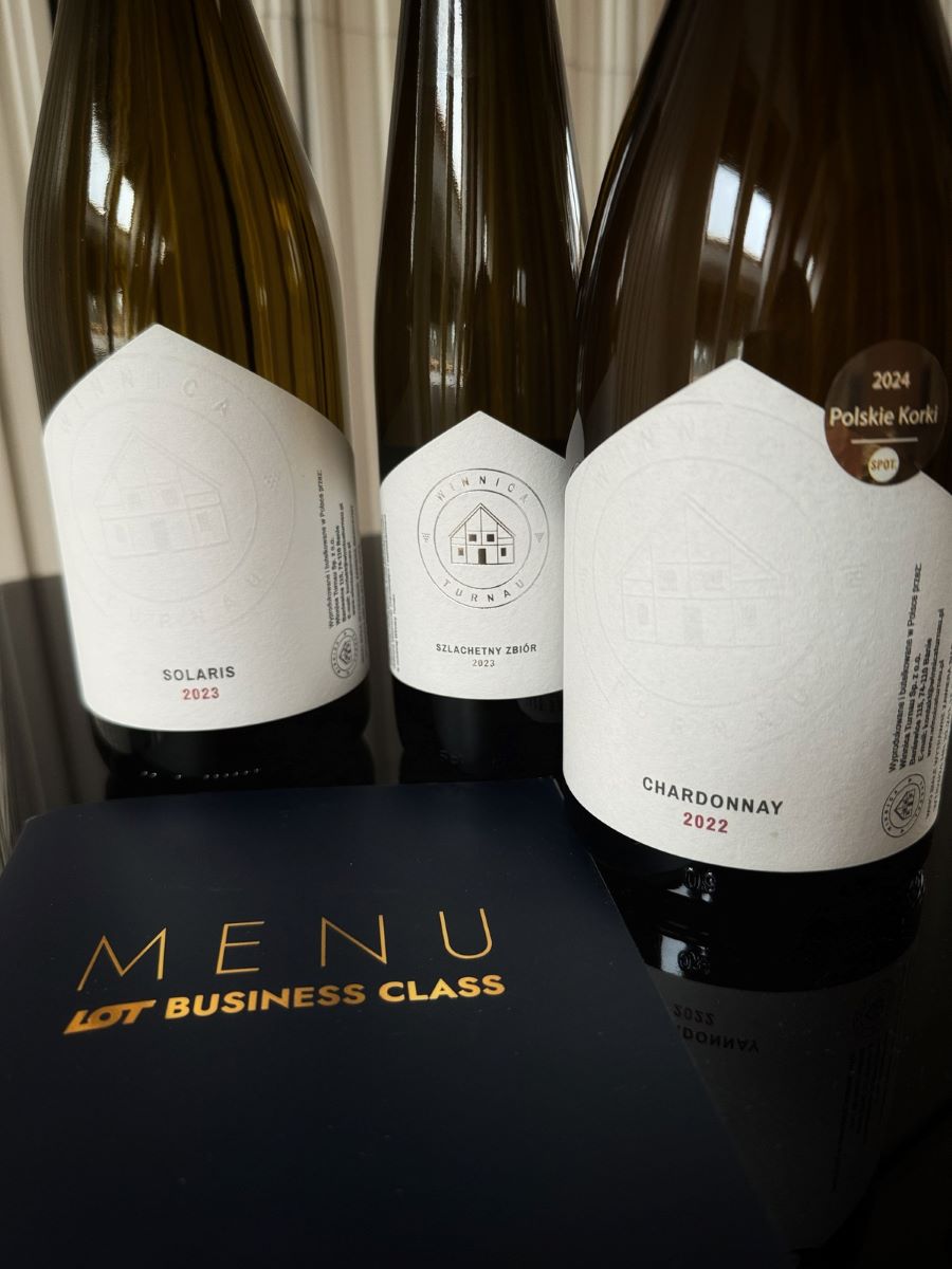 Przedstawiamy najnowsze menu Business Class LOT-u. Znajdziecie w nim aż trzy nasze wina: uskrzydlone tegorocznym sukcesem Chardonnay 2022, szybującego na wyżyny przyjemności Solarisa 2023 i słodycz najwyższych lotów – Szlachetny Zbiór 2023.
