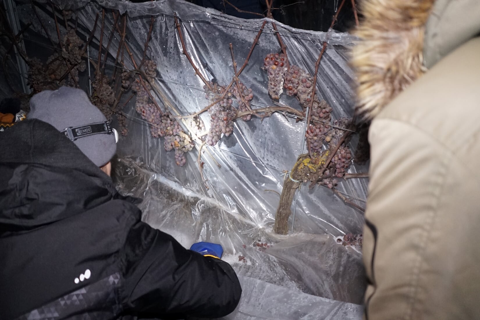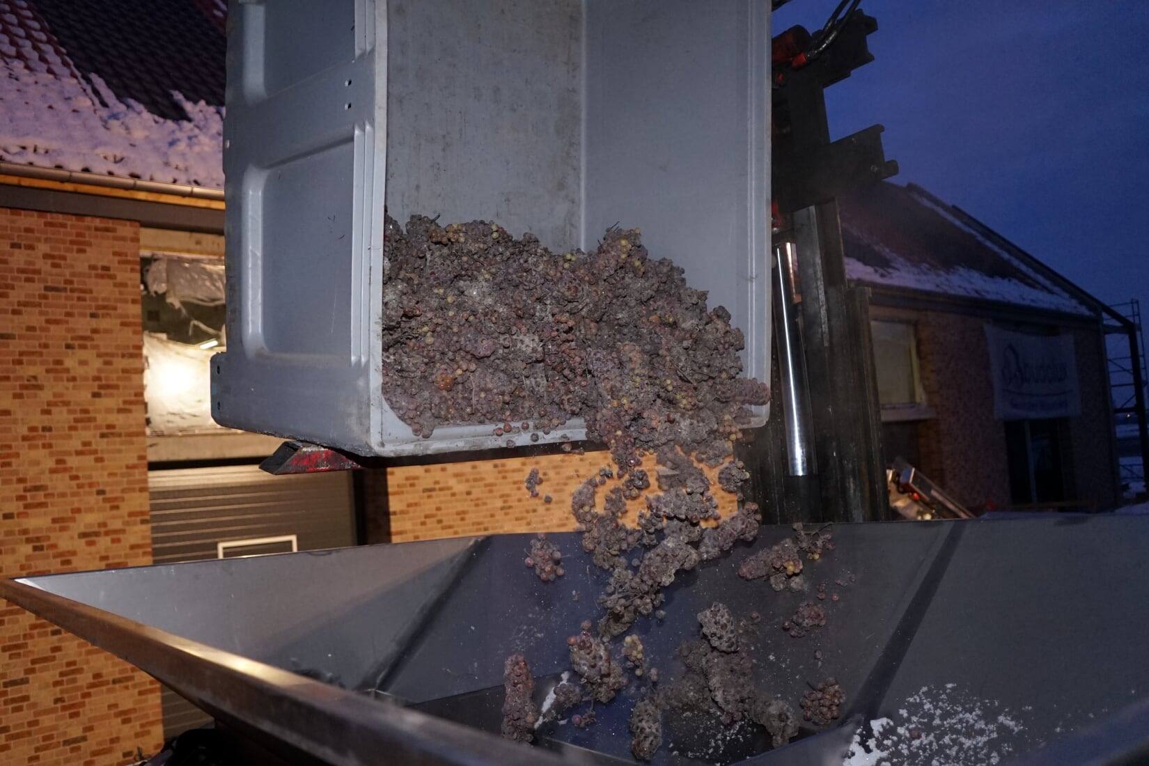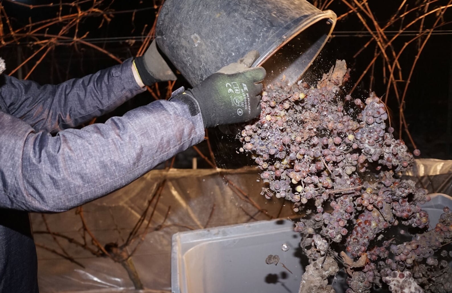 Nad ranem zmrożone grona trafiły do prasy, dając gęsty, złoty nektar, z którego powstanie wino lodowe.