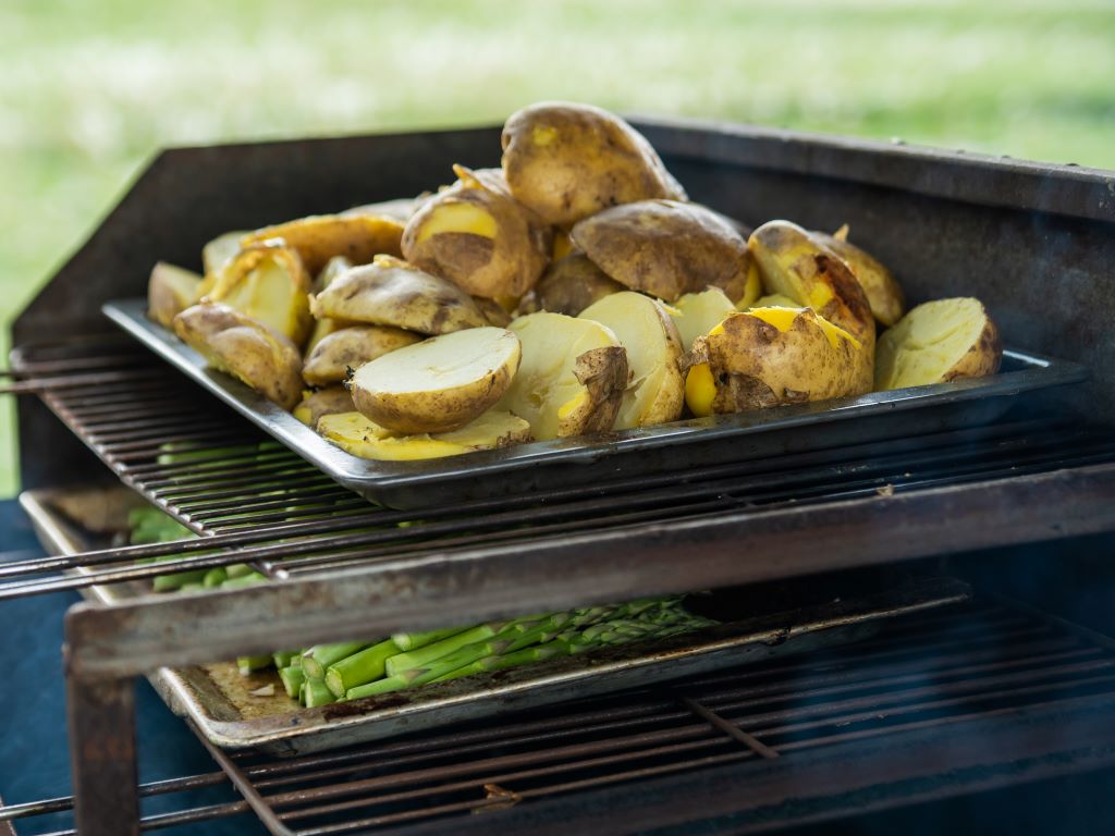 Polędwica wieprzowa, młoda marchew, zielone szparagi, ziemniak pieczony, sos tzatzyki i sos pieprzowy